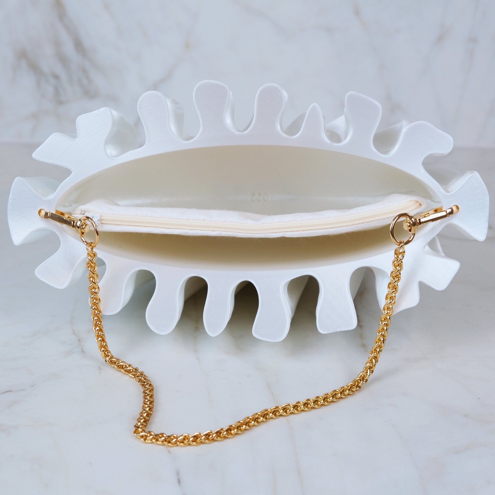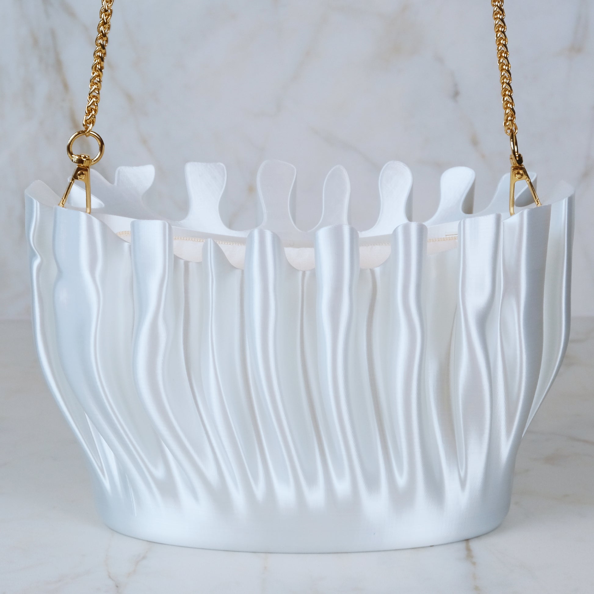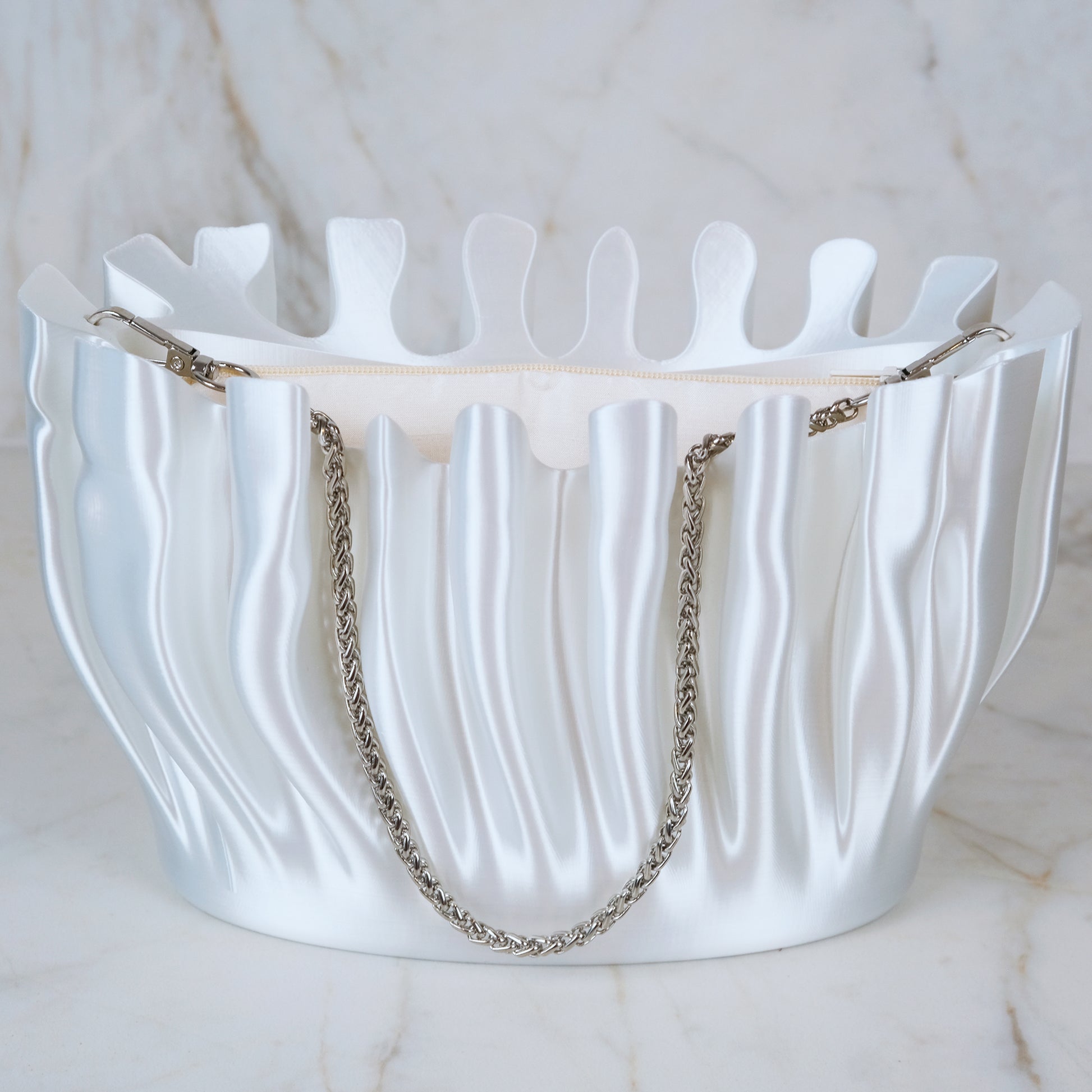 The CORALINE Clutch can be carried by hand or via the included carrying chains. Each Clutch features an entirely 3D printed shell, with a removable zippered silk pouch to secure your smaller valuables, and a cotton dust-bag for storage.
